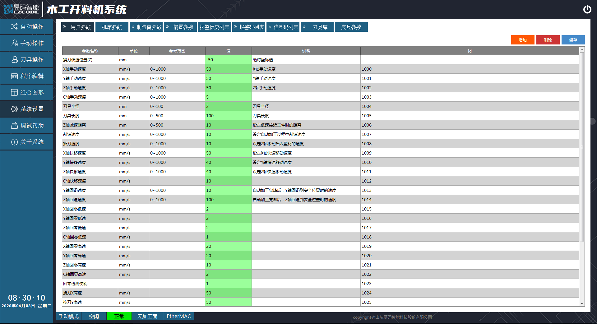 該系統采用EZ-601控制器,搭配EZ-DM3224c遠程I/O模塊,具有數控CNC功能,可滿足復雜加工要求,已廣泛應用于板式家具開料,開孔、木門雕刻等設備。特點